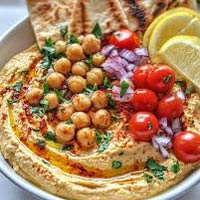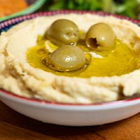 Hummus topped with olives and your choice of grilled chicken or lamb