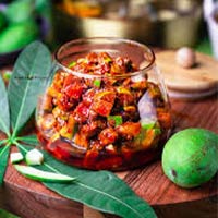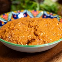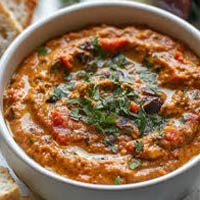 Moroccan eggplant dip spiced with diced tomatoes, onion, garlic. Served hot with pita