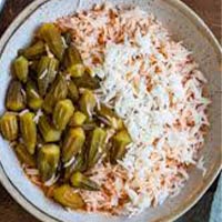 Eggplant stew with tomatoes and onions, served with saffron rice