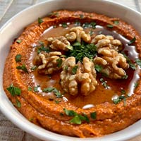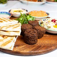 Muhammara, baba ghanoush, falafel, hummus, pita